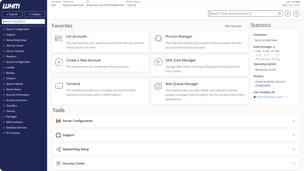 WHM (WebHost Manager) adalah panel kontrol administratif yang kuat yang digunakan untuk mengelola beberapa akun cPanel. Panel ini memungkinkan Anda untuk membuat, mengubah, dan mengelola akun hosting, memantau status server, mengonfigurasi pengaturan keamanan, dan mengalokasikan sumber daya—semua dari satu dasbor.